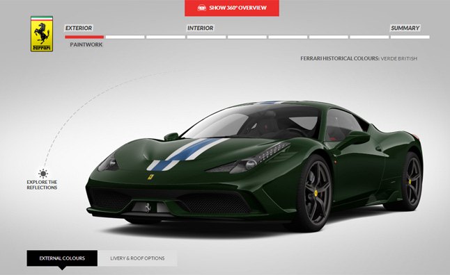 Ferrari 458 Speciale konfigūratorius yra vienas iš labiausiai išplėtotų šios kategorijos įrankių, siūlantis platų pasirinkimų spektrą. Pradedant nuo automobilių spalvų įvairovės, jis leidžia vartotojui rinktis iš skirtingų dizaino elementų, tokių kaip livery, ratlankiai, stabdžių suportai ir dar daugiau. Be to, interjero pasirinkimai yra labai įvairūs, suteikiant galimybę pritaikyti sėdynių dydį ir formą, taip pat tachometro spalvą.